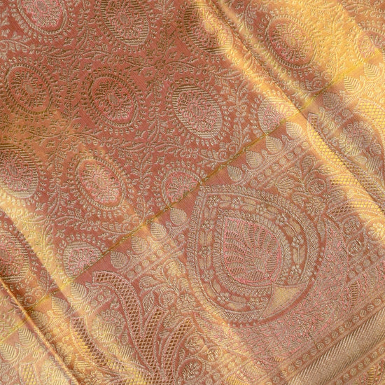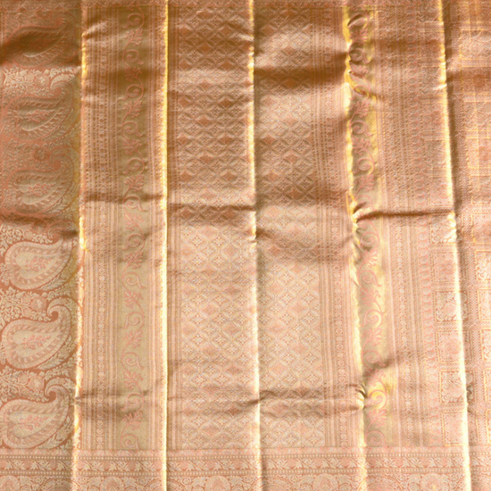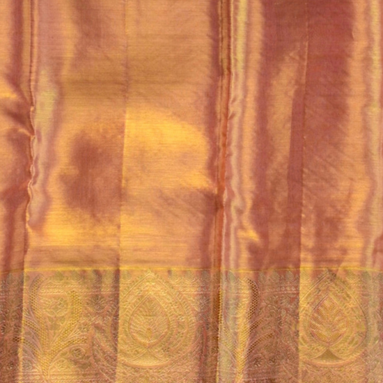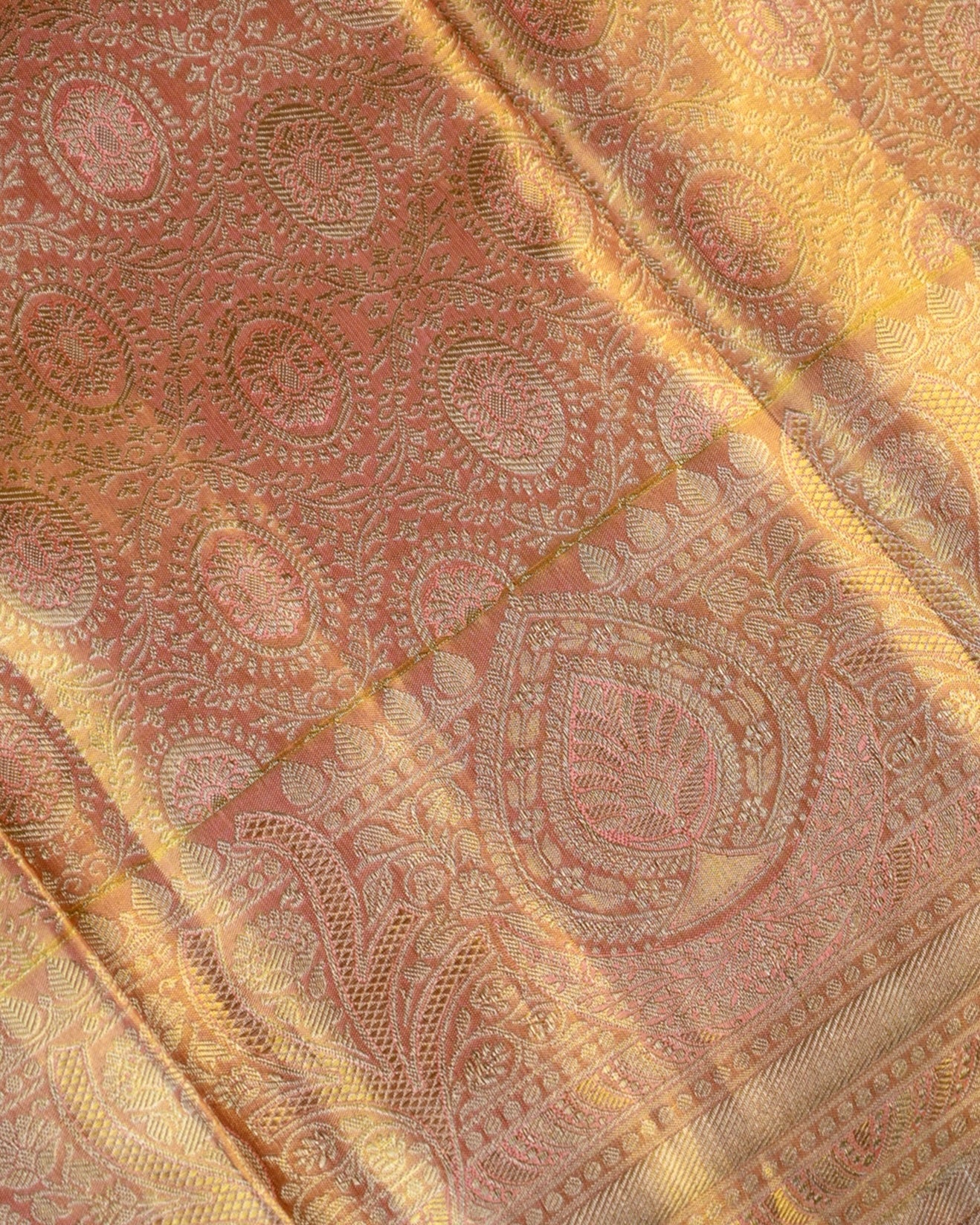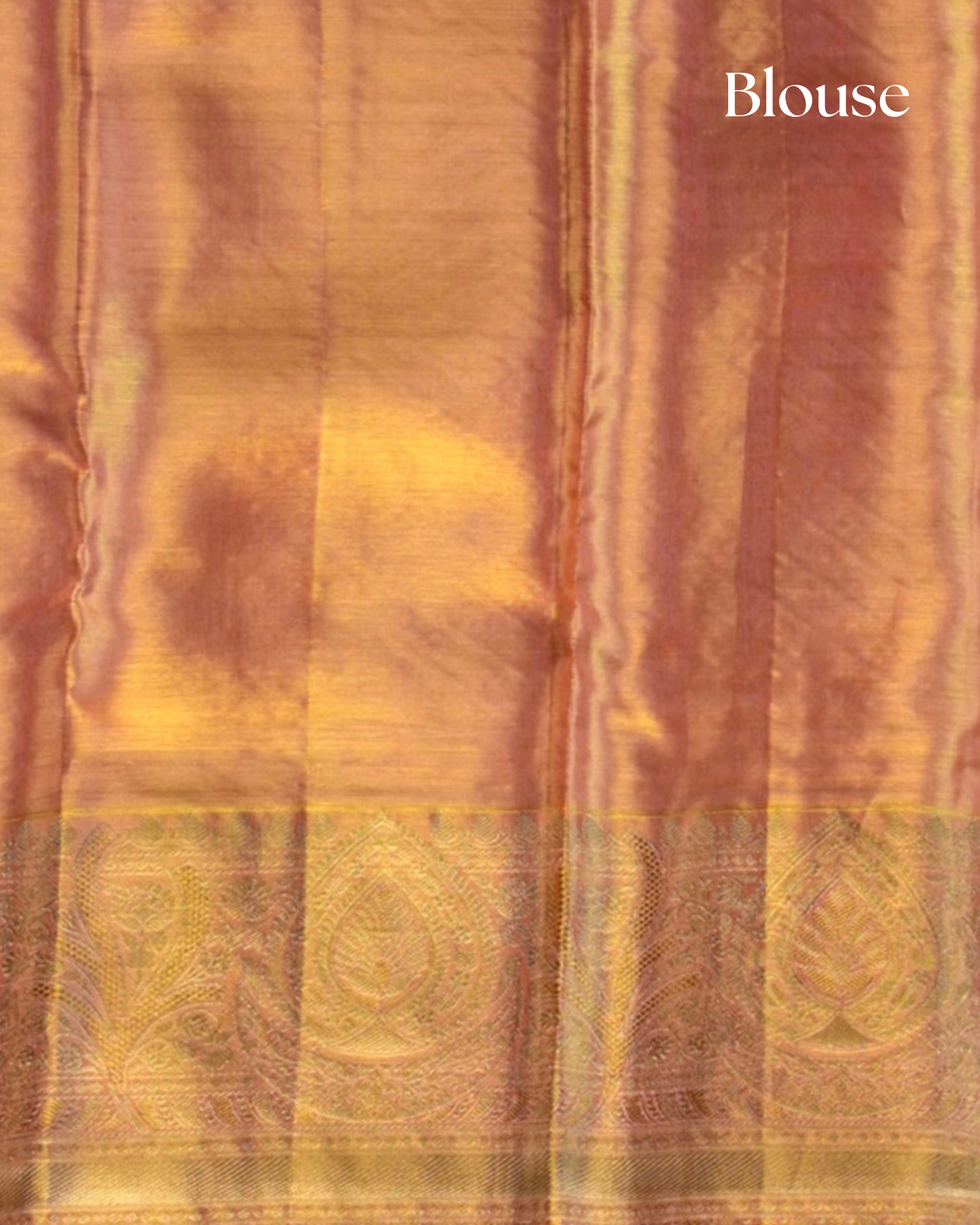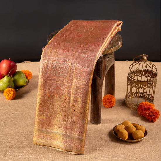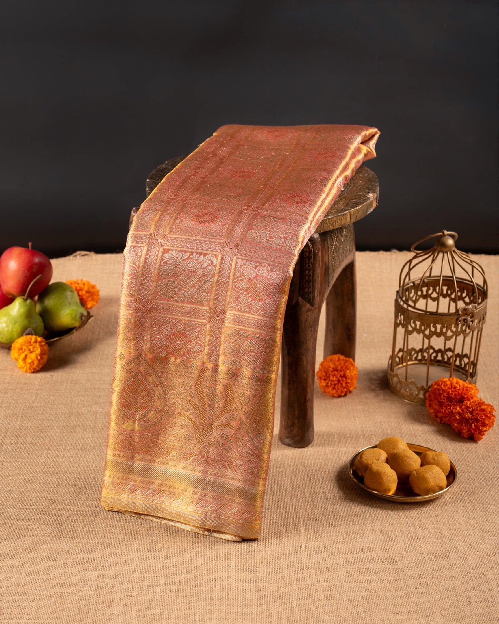 A radiant blend of tradition and intricate artistry, this golden-pink tissue silk saree is woven with a harmonious mix of floral buttas and classic checks across the body. The lustrous pink-gold tone adds a soft yet striking glow, making it an elegant choice for special occasions.
