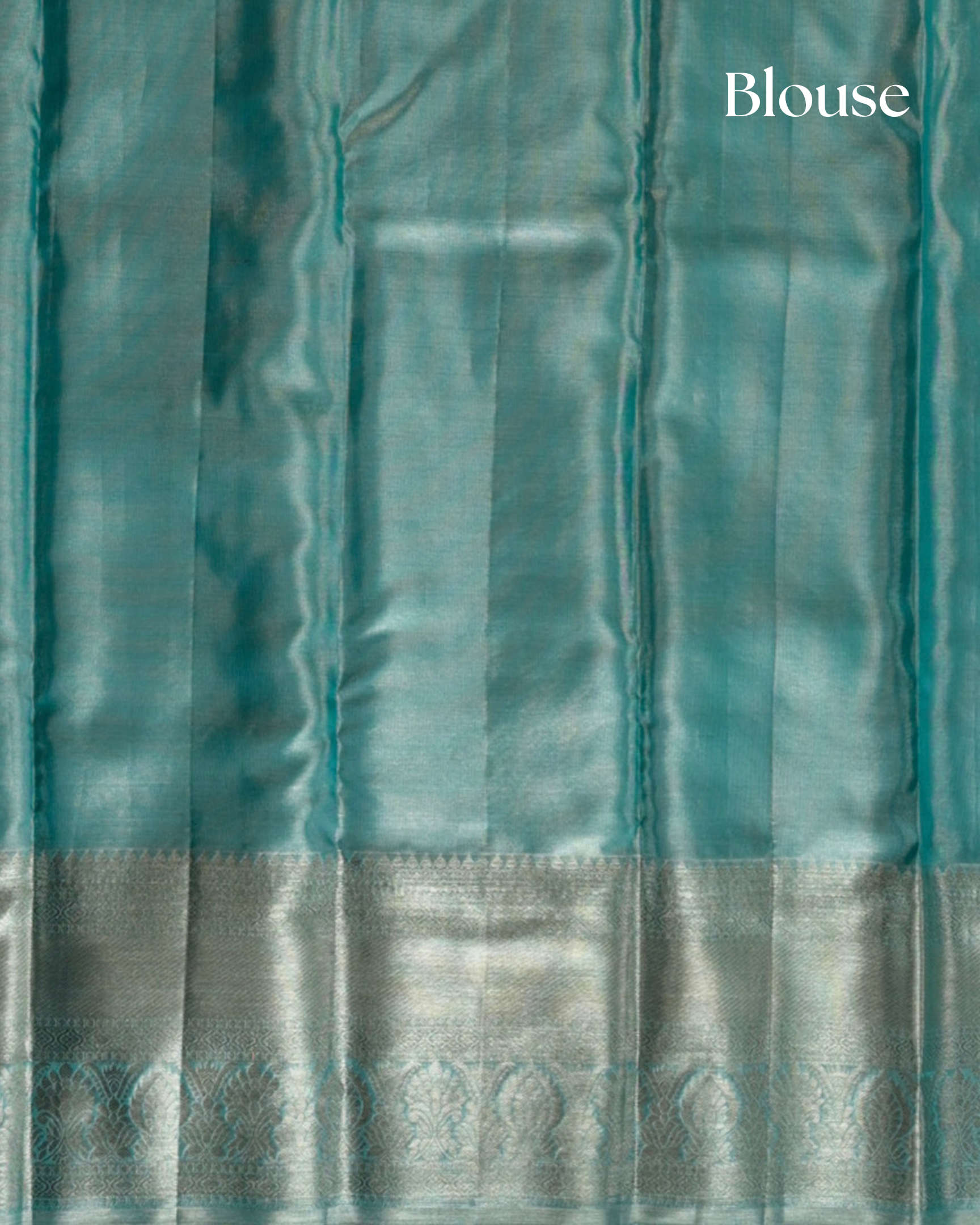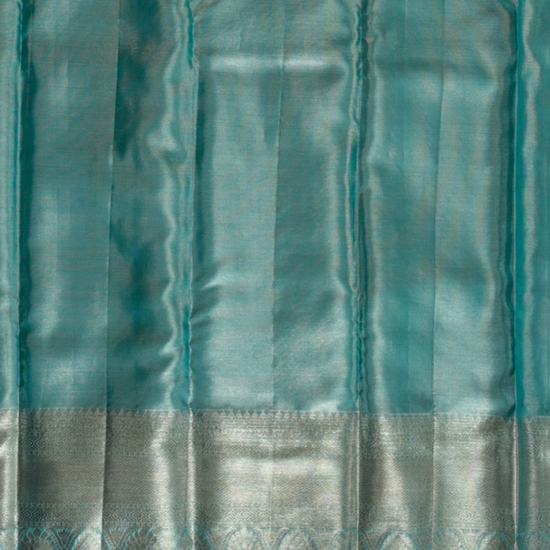 A mid-sized border lends balance and structure, while the rich pallu is adorned with finely woven silver motifs that enhance the saree’s regal appeal. Completed with a plain pastel blue tissue blouse, this saree is an elegant choice for weddings, festivities, or any occasion where modern elegance meets traditional finesse.