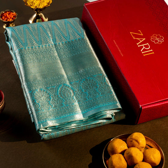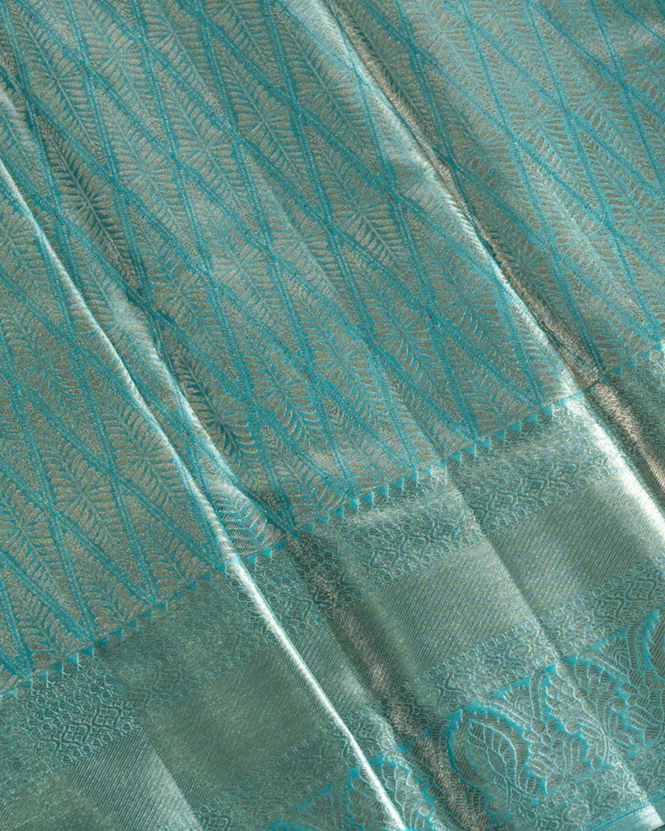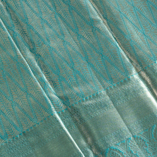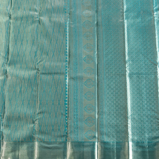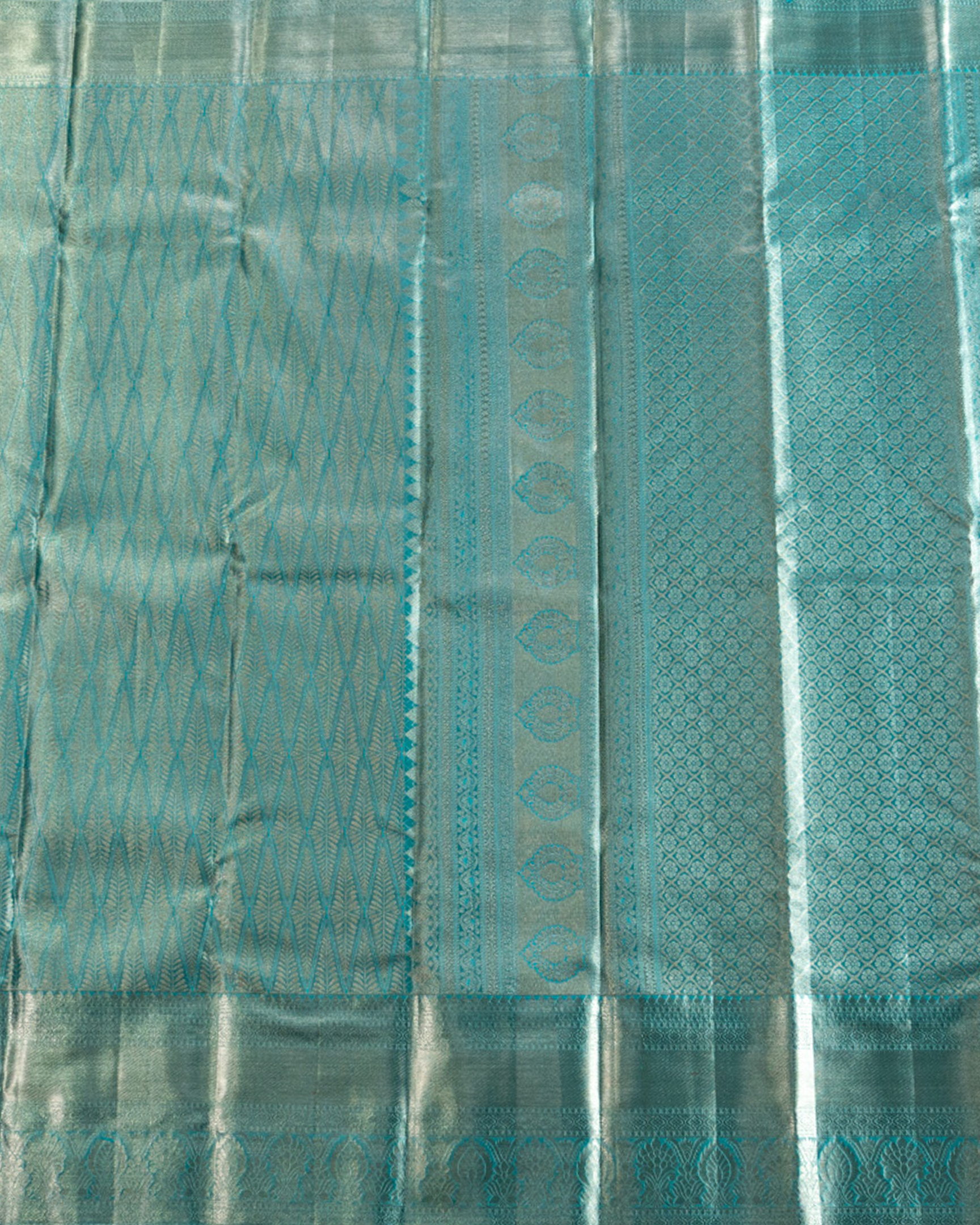 Crafted from 100% pure silk, this pastel blue tissue saree embodies timeless artistry with a fresh, contemporary tone. The body is detailed with delicately woven diamond-shaped motifs, each intricately designed and highlighted with silver zari—creating a subtle shimmer that elevates the drape with graceful movement.