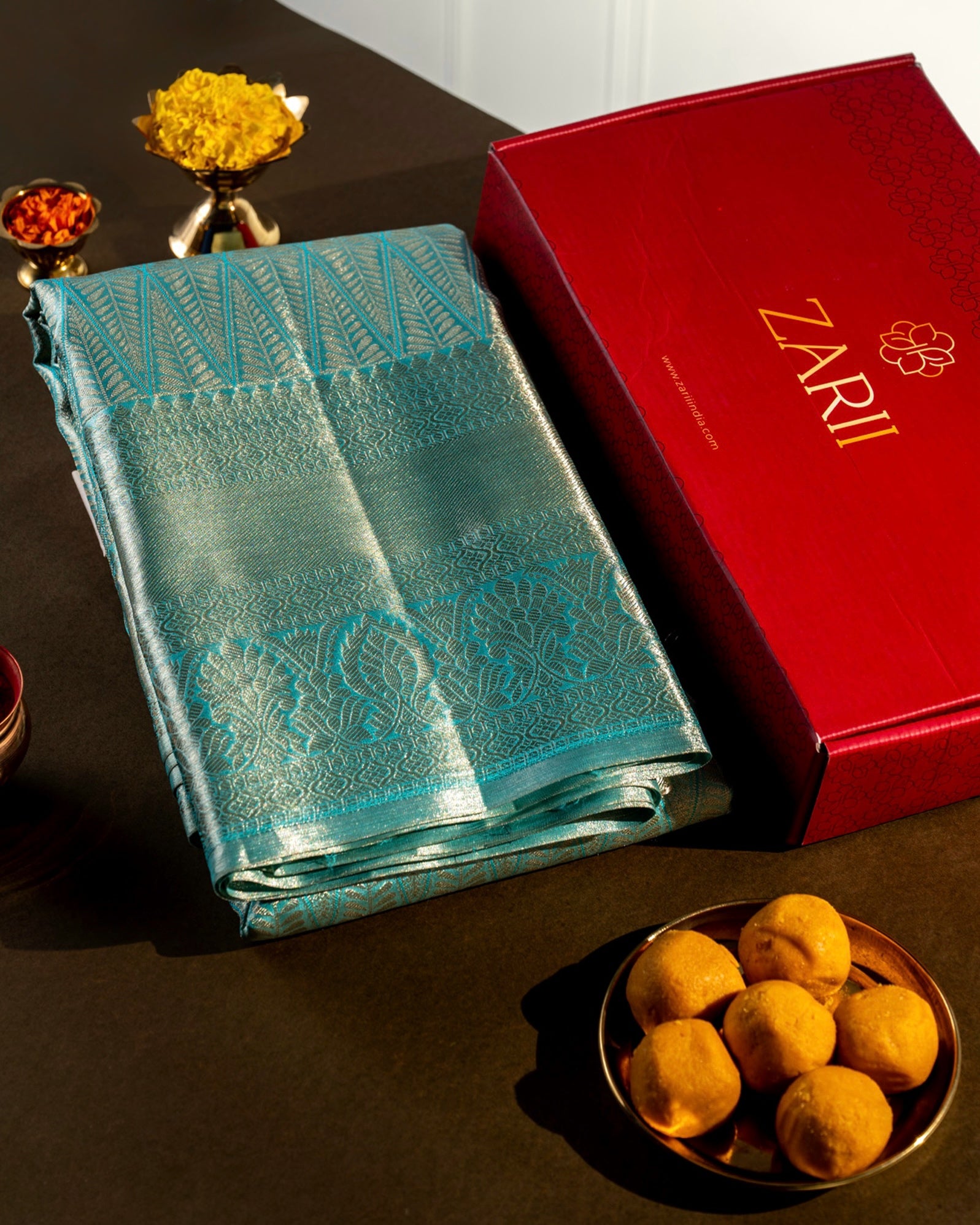 Pastel Blue Pure Tissue Silk Saree with Diamond Motifs and Rich Pallu