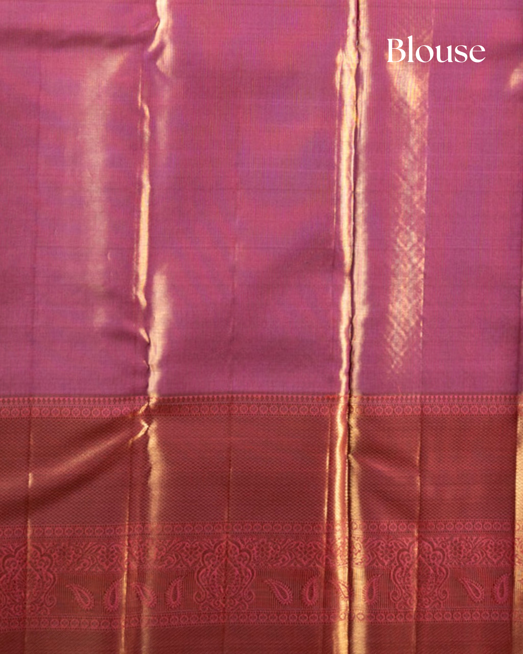 This pastel pink tissue silk saree is adorned with intricately woven tiny lotus motifs, bringing subtle rhythm and elegance to the soft-toned body. The natural sheen of the fabric highlights the refined detailing, giving the drape a refreshing yet timeless appeal.