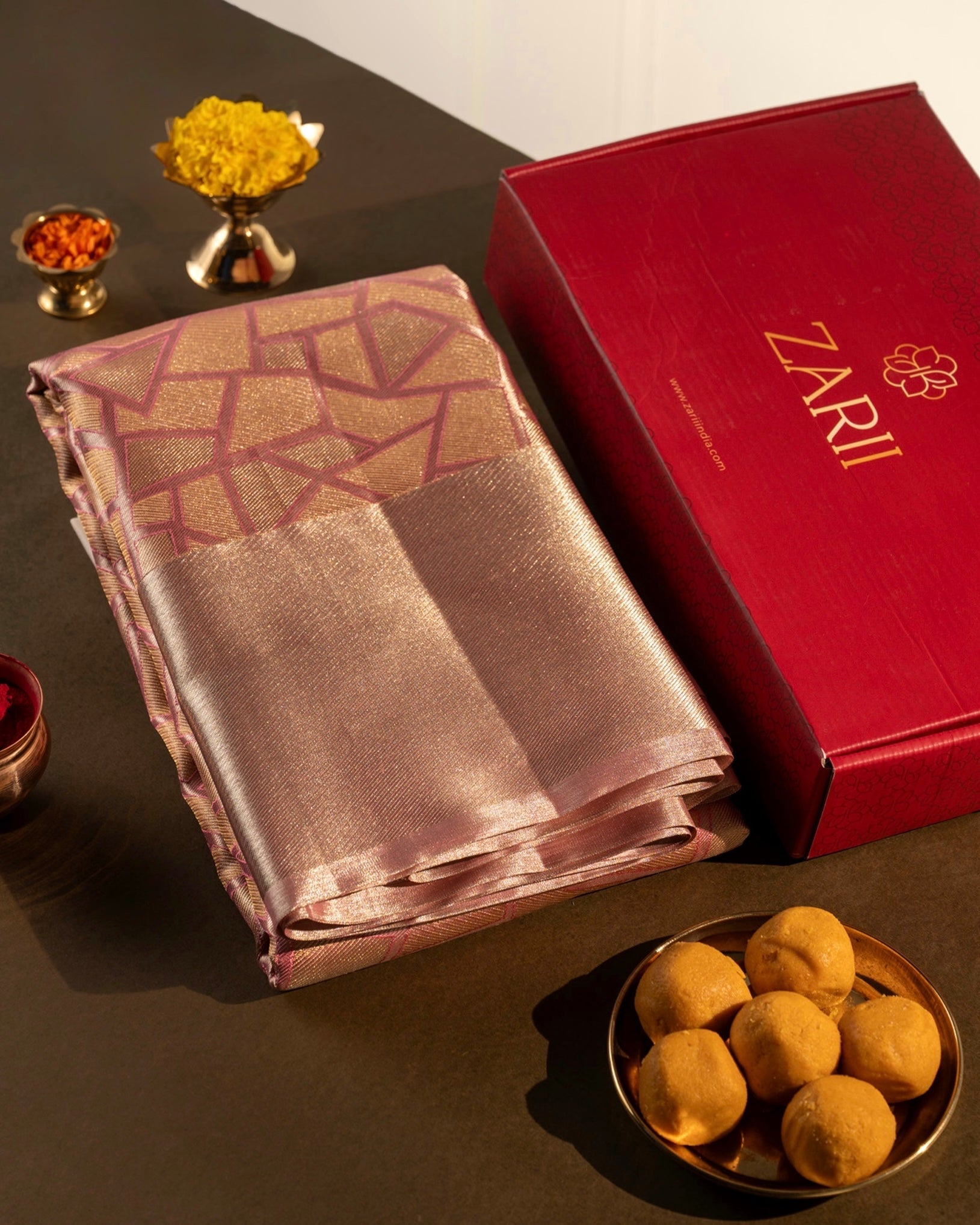 A bold blend of modern design and classic elegance, this pastel pink tissue silk saree stands out with its unconventional geometric weave. The body features a striking interplay of pink, gold, and light silver tones, creating a layered texture that shimmers subtly with movement. The unique colour story adds depth and dimension to the structured pattern.